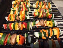 They will feast on fresh chicken, beef, and vegetable kabobs that are marinated ahead of time then barbecued by our talented barbecue chef. We also serve fresh fruit in season (perhaps watermelon and strawberries, or what is best at the time), green salad, potato and/ or other salad, and chips, rolls, vegetables, dip, then a nice dessert. We also can include vegetarian burgers and other dietary options. Other items may be added on or substituted with the season.